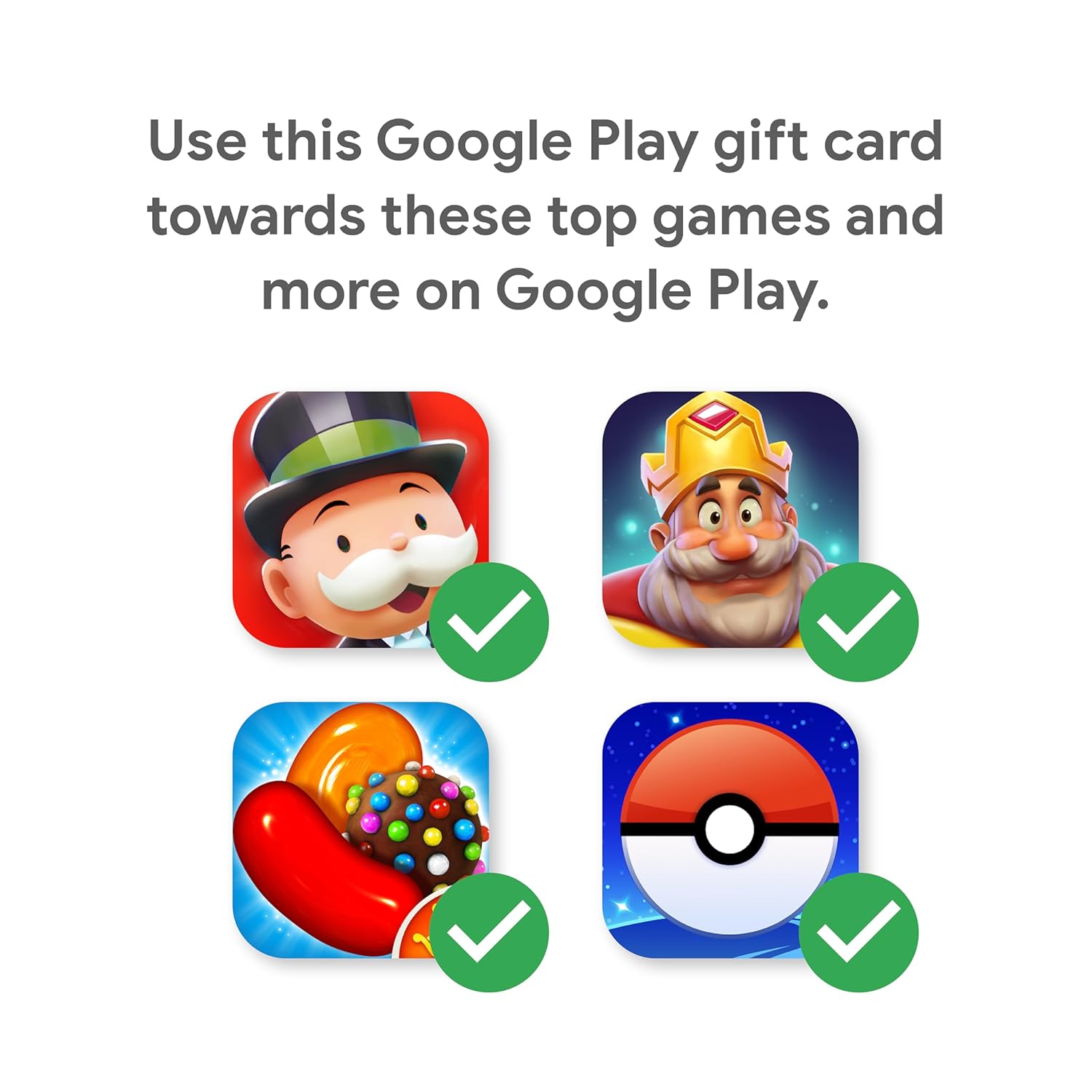 New finds, old favorites, one card. Choose a unique gift card design featuring your favorite games or apps. This card can also be used for anything else on Google Play. Thereβs something for everyone, so find whatβs yours. Go Play.