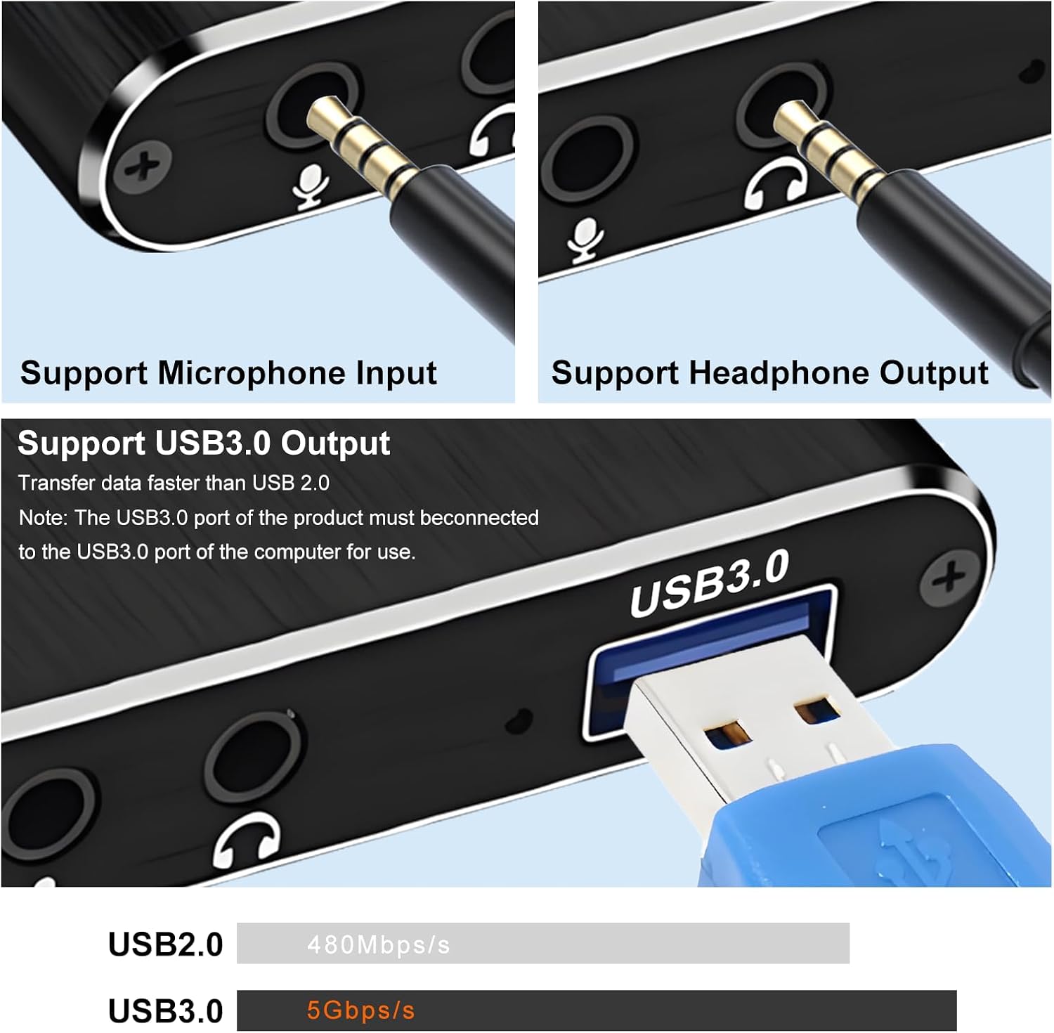 γ3.5MM Microphone Input and Headphone OutputγYou can connect the capture card for streaming to a headphone connection with a 3.5.mm audio output port, and you can also connect the capture card to a 3.5mm microphone so you can easily stream sound and record your voice through the port. You can also use it to freely add external commentary while playing games. Note: Do not use a hub or USB extension cable, the USB port of the product must be connected to the USB 3.0 port of your computer for use