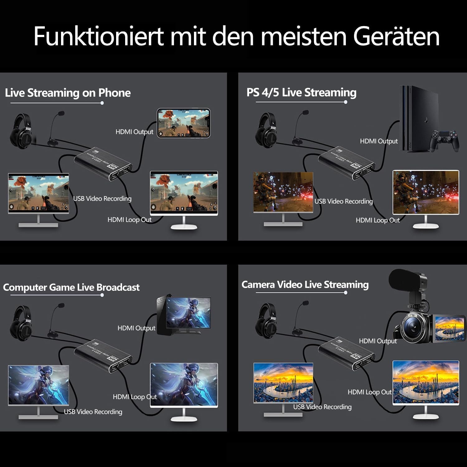 Support operating system: Android, Mac OS, Linux, Windows or higher. Widely compatible: Projectors, notebooks, camcorders, set-top boxes, DVDs, Nintendo Switch/Switch 2, PS4/PS5, Xbox game consoles, etc.Suitable social media: Youtube Live, Facebook Live, Twitch, Twitter, Wowza, LinkedIn, XSplit, Google Hangouts, Skype, Zoom, Microsoft Teams, etc.Supported acquisition software: OBS, VLR, Potplayer, QuickTime, Amcap, Wirecast, VidblasterX, Resolume, Windows Media Encoder, Adobe Flash Media Live Encoder, Real Producer Plus, etc.