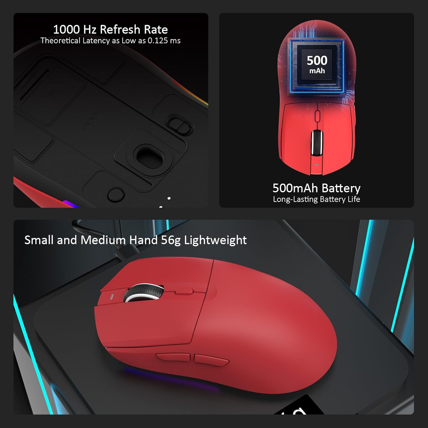 γRGB Backlit Charging Dock & 500mAh Batteryγ This mechanical gaming mouse charges rapidly via its stylish RGB backlit charging dock, featuring customizable RGB lighting effects adjustable via dedicated buttons. Equipped with a built-in 500mAh battery for extended battery life, it minimizes the need for frequent recharging.