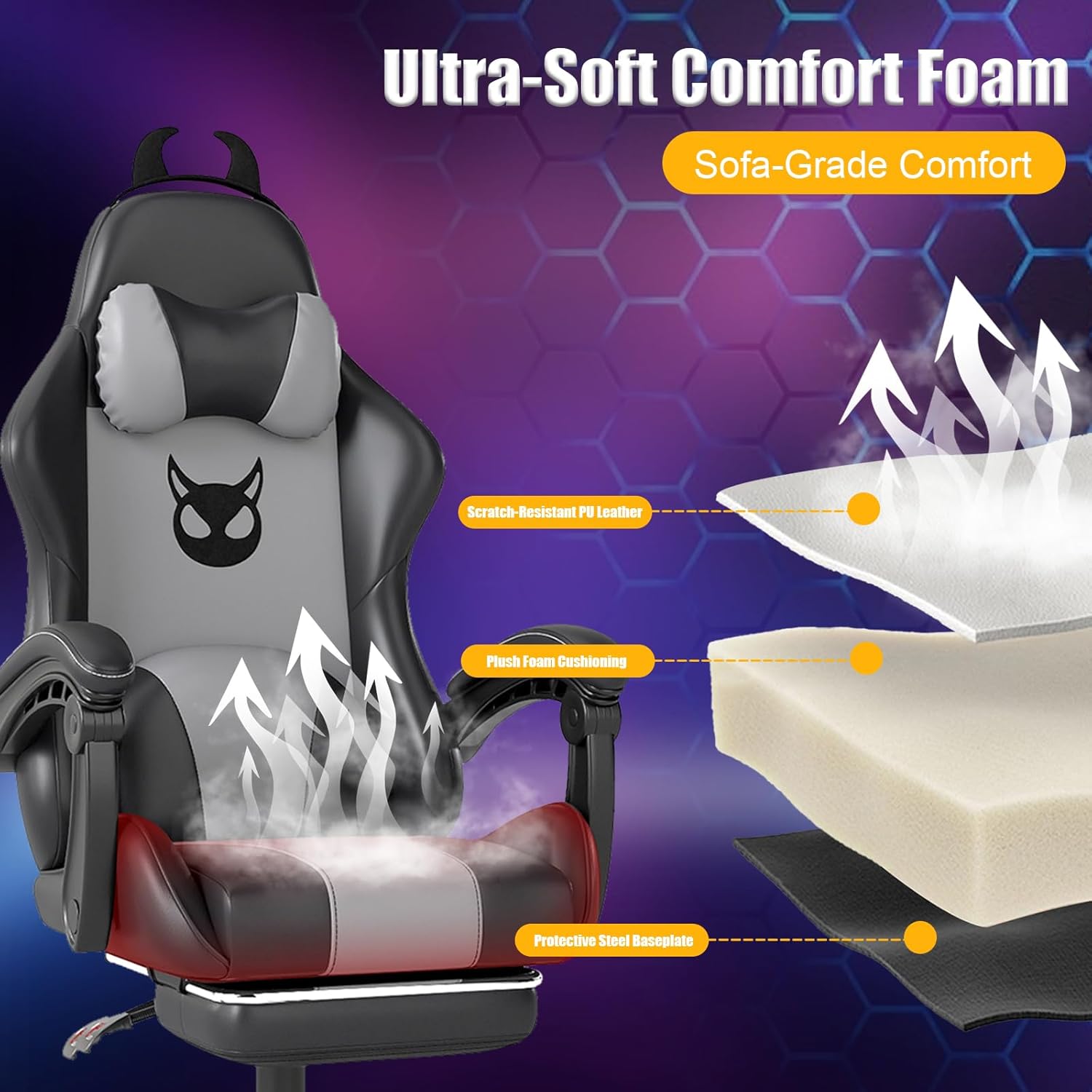 【Unique Little Devil Design】Stand out with this gaming chair featuring playful little devil decorations on the backrest and removable devil-style ears on the headrest. These fun details add personality to your setup, and the decorations can be easily swapped for your own favorite accessories.