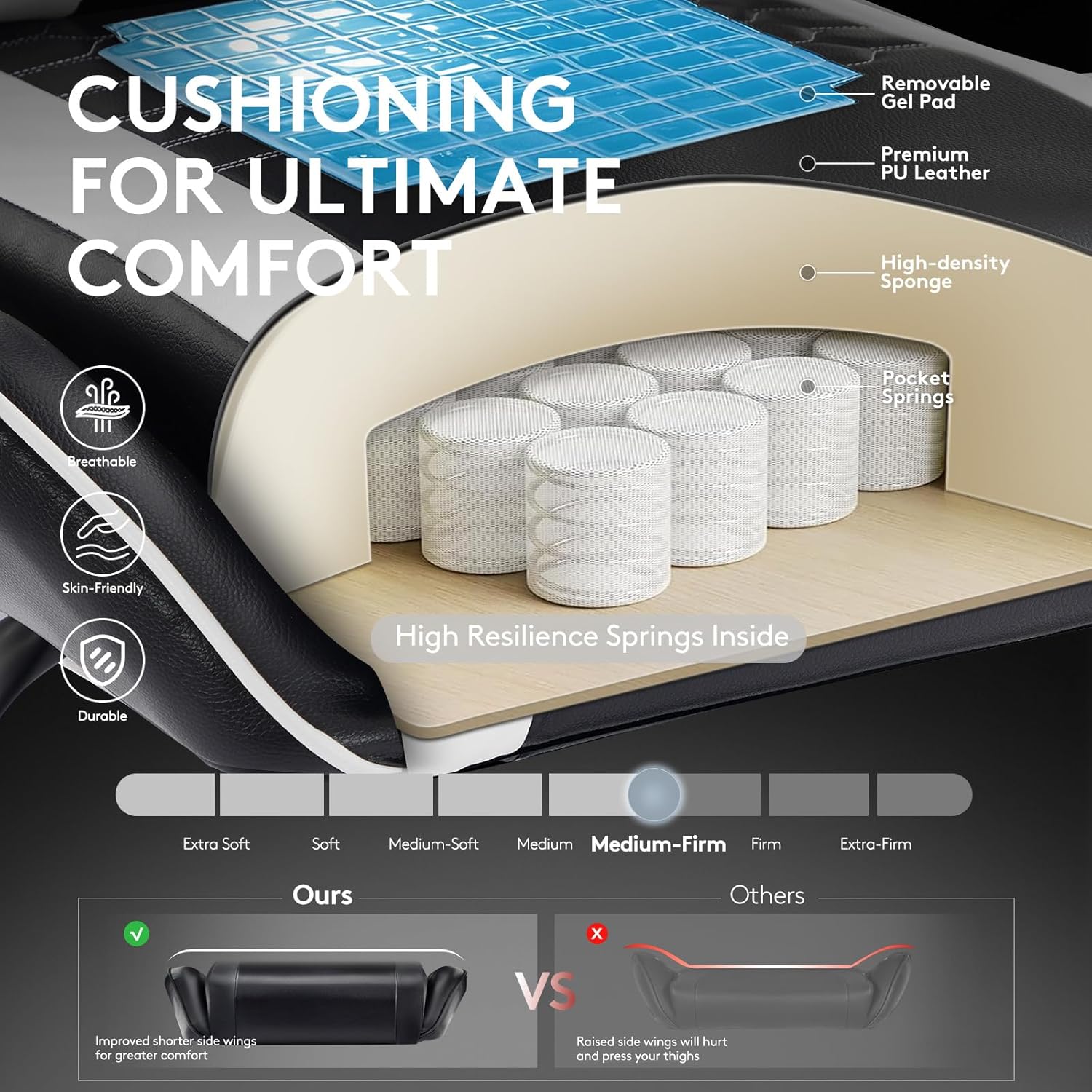 Ultimate Comfort & Ergonomic Support: Experience sofa-like comfort with a thick seat cushion featuring high-density foam and elastic pocket springs that evenly distribute body pressure. The shorter side wings accommodate a wider range of body shapes while ensuring thigh comfort. The contoured backrest supports the natural curve of your spine, while the adjustable massage lumbar pillow and headrest help relieve back and neck strain. Breathable materials keep you cool and comfortable even during long sessions.
