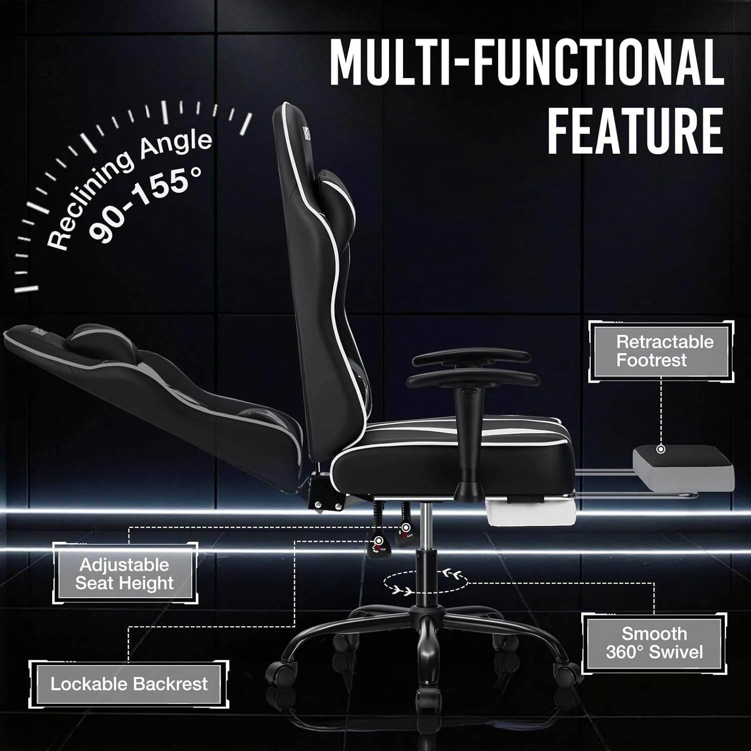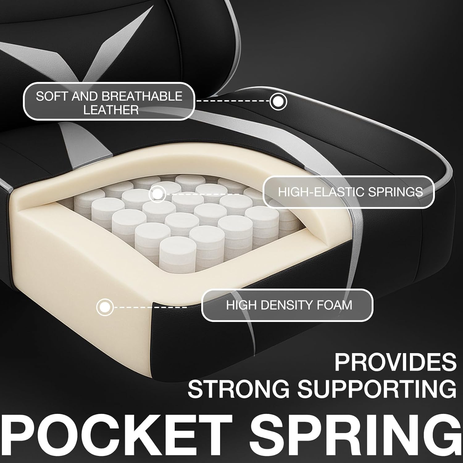 【Comfortable Ergonomic Game Chair】90°-155° reclining gaming chair with wrapped backrest,headrest,and lumbar pillow fits the player's spine curve, effectively alleviates the pressure on the back and improve your gaming experience.Seat cushion made with soft, breathable leather and high-density foam for ultimate comfort, featuring high-elastic pocket springs for strong, responsive support, ensuring durability and a superior seating experience for gaming or work