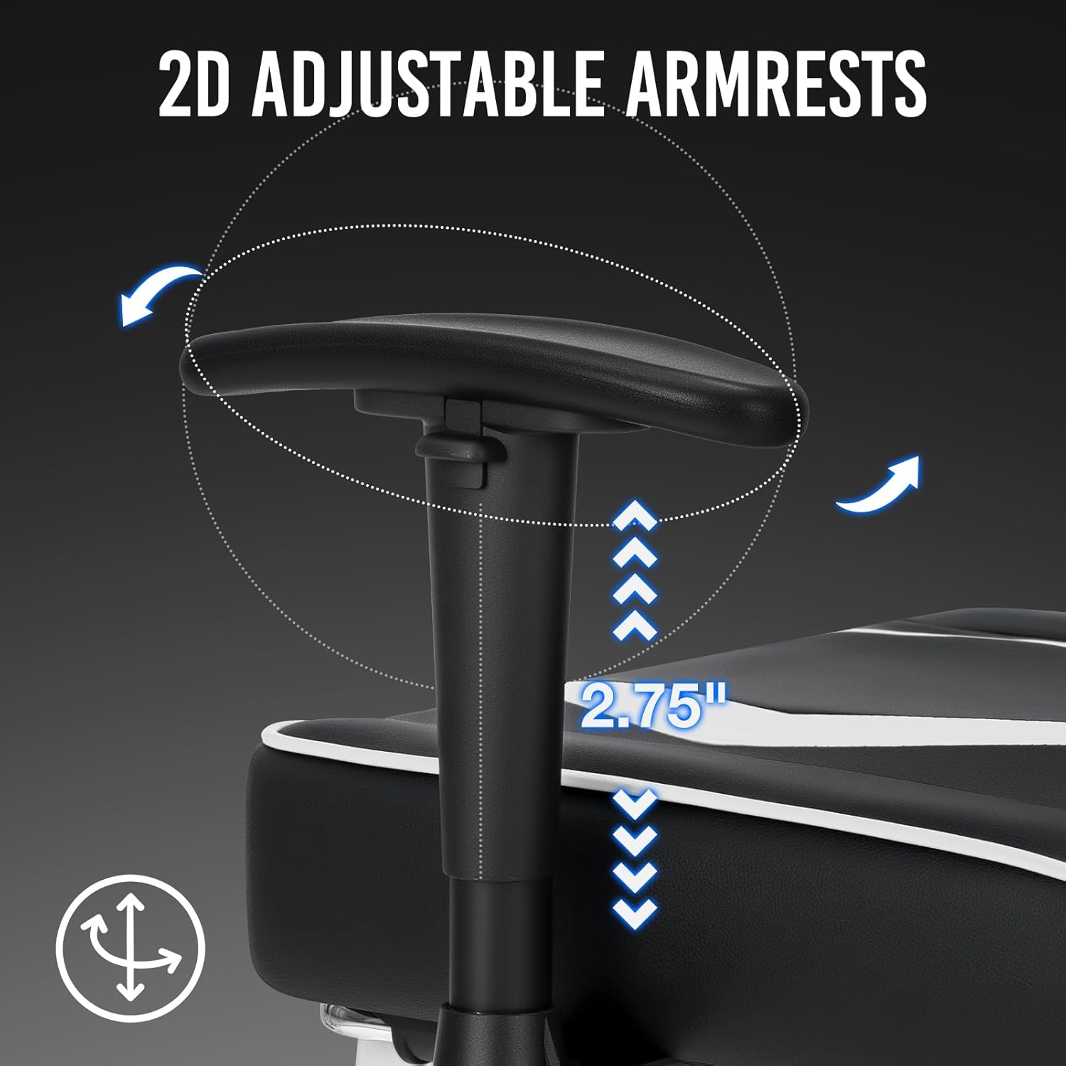 【2D Armrest】Easily adjust the armrests in multiple directions to perfectly align with your arms and wrists. With a 2.75-inch height adjustment range, inward/outward rotation, and precise angle tweaks, this 2D armrests deliver customized comfort for an enhanced gaming or work experience