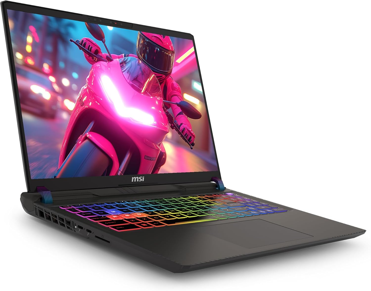 Intel Ultra 7-255HX Processor Experience lightning-fast processing speeds and seamless multitasking, perfect for gaming, streaming, and productivity. NVIDIA GeForce RTX 5070 Ti Graphics (12G GDDR7) Enjoy realistic ray-traced graphics and AI-enhanced performance for the latest AAA titles and creative applications. 16" UHD+ IPS Display (1920x1200 144Hz, 16:10 Aspect Ratio) Immerse yourself in crisp, detailed visuals with a high refresh rate for ultra-smooth gameplay and reduced motion blur. Advanced cooling with Shared-Pipe design and MSI Cooler Boost 5 technology Keep your system cool and quiet during intense gaming sessions with MSIβs advanced thermal solutions. Sleek, Durable Design The MSI Vector 16 HX AI features a modern, robust chassis designed to withstand the demands of gaming on the go.