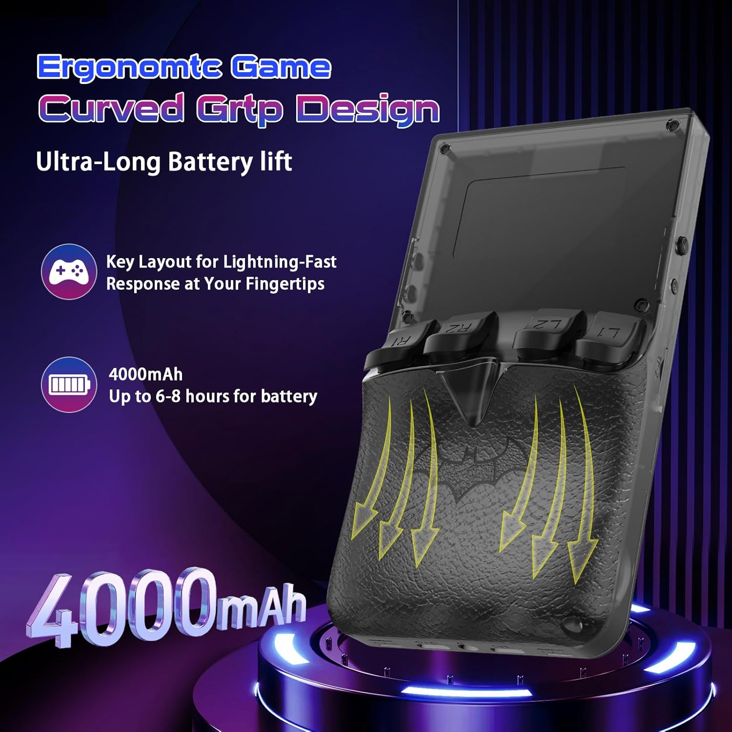 γDesigned for portability 4000mAh Powerful BatteryγPortable lightweight design with 4000mAh battery fuels up to 6-8 hours of play. making it perfect for gaming on the go.Built-in speakers and a 3.6mm jack offers private immersion. Take your games anywhere, relish uninterrupted fun.
