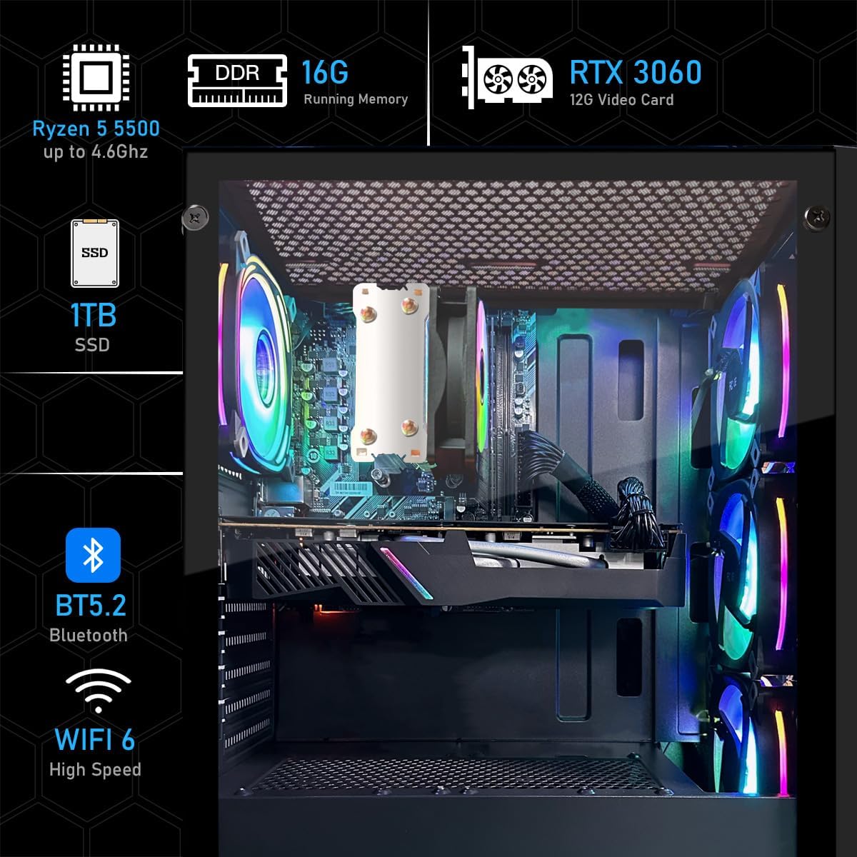 PC Gaming System: This gaming computer desktop is loaded with AMD Ryzen 5 5500 3.6GHz up to 4.2GHz | 16GB DDR4 Memory | 1TB Solid State Drive | Genuine Windows 11 Home 64-bit